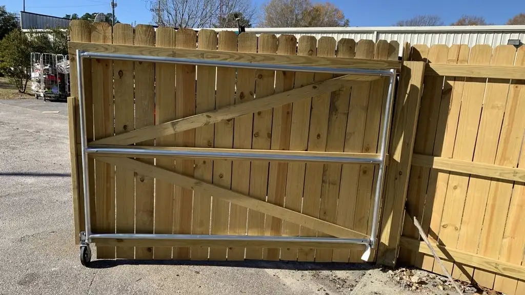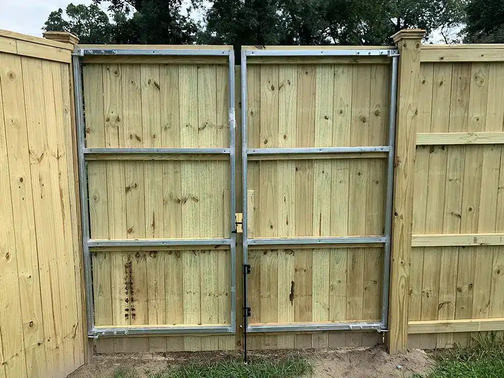 When properly constructed, a wood gate with a will be able to support the weight of most gates. However, having your gate installation company upgrade the framing of the gate to a welded steel frame will create additional support. Going with a metal gate frame will also help combat common gate problems related to warping and twisting lumber. This is especially helpful when a gate installation company is building a gate door that is larger than the standard 4ft width.