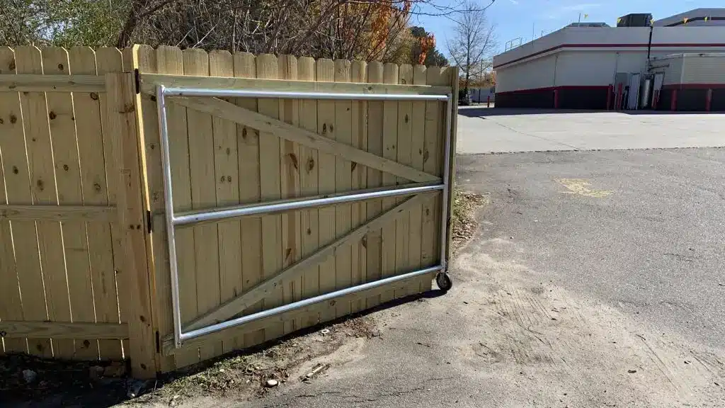 Big Jerry’s Fencing offers professional pneumatic wheel gate installations that provide a practical and efficient solution for uneven or sloped terrain. Designed with heavy-duty pneumatic wheels, these gates roll smoothly over gravel, grass, or irregular surfaces, making them ideal for driveways and wide entryways where a standard gate might struggle. Our team ensures each installation is built for stability, durability, and ease of use, with materials and finishes that complement your property. Whether for residential or commercial applications, Big Jerry’s delivers a smart, functional gate system that holds up to daily use and challenging conditions.